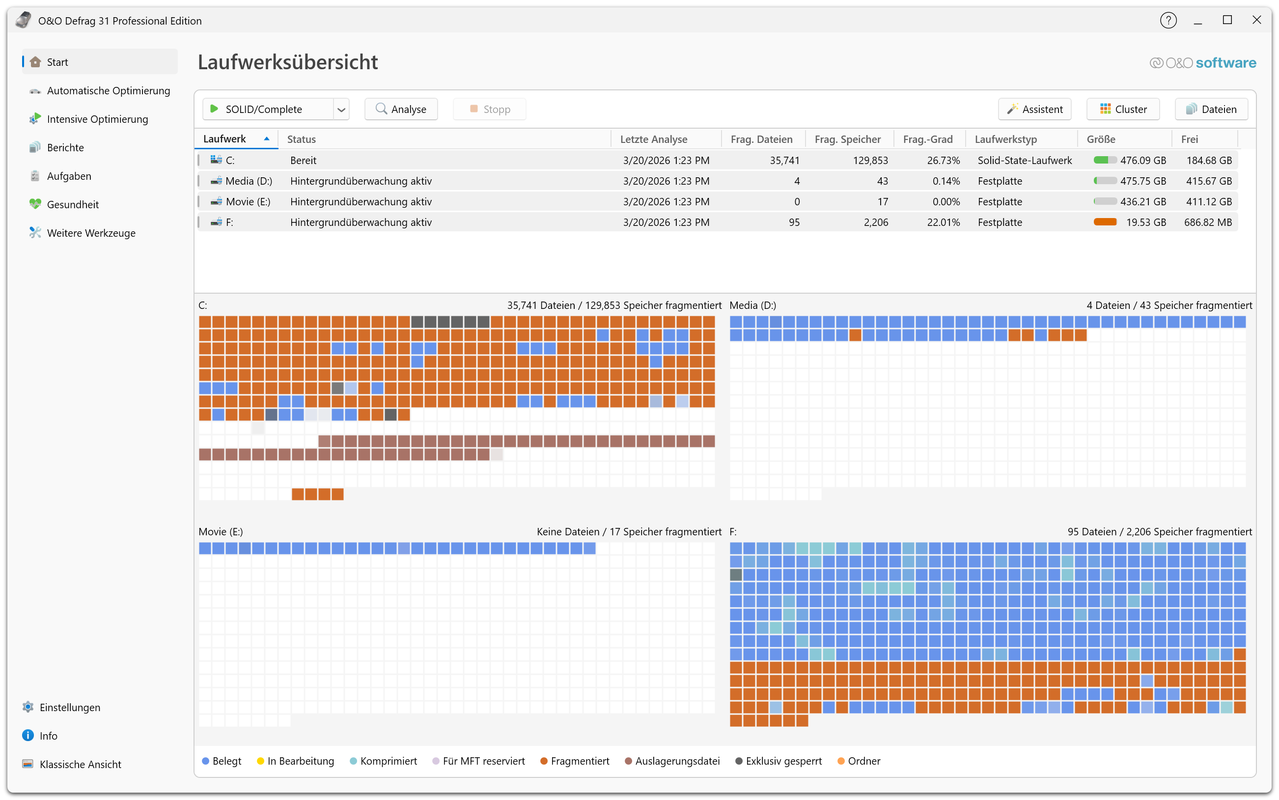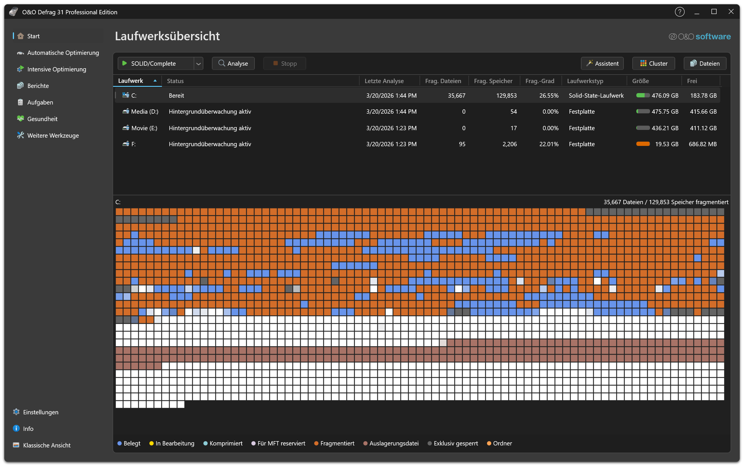 Nach der Aktivierung analysiert O&O Defrag automatisch Ihr System und empfiehlt die optimalen Einstellungen für Ihre Laufwerke. Mit nur wenigen Klicks können Sie die Optimierung starten und die Leistung Ihres Systems spürbar verbessern.