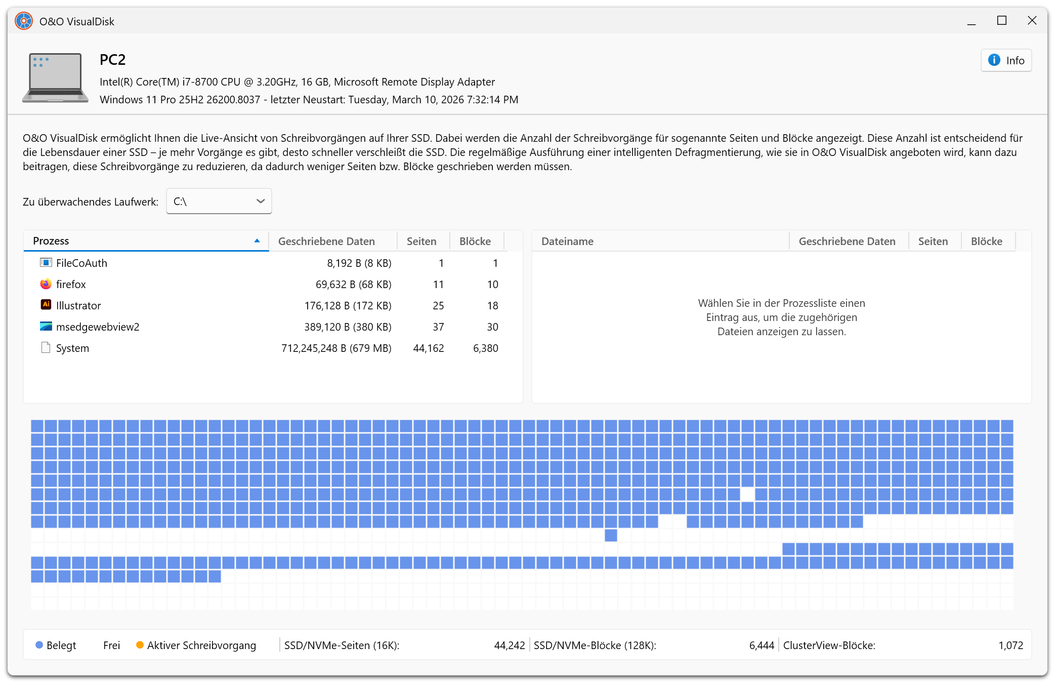 VisualDisk zeigt Ihnen grafisch die Schreibzugriffe auf SSDs und NVMe-Laufwerke. So erkennen Sie, wie Defragmentierung unnötige Schreibvorgänge reduziert, die Lebensdauer Ihrer Laufwerke verlängert und Abnutzung verhindert.